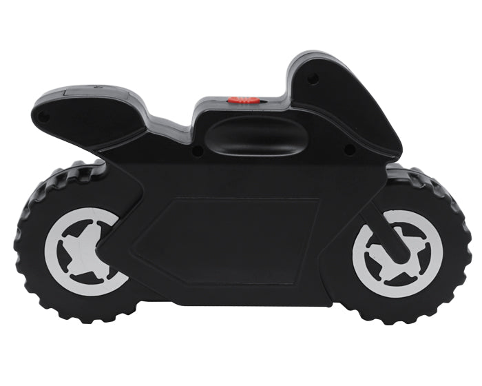 set de herramientas con luz led en forma de motocicleta que incluye: 4 dados, desarmador con adaptador y extensión, 10 puntas, 4 desarmadores relojeros con imán y un flexómetro de 100 cms (1m). 4 baterías incluidas de botón. presentación: caja en color blanco.