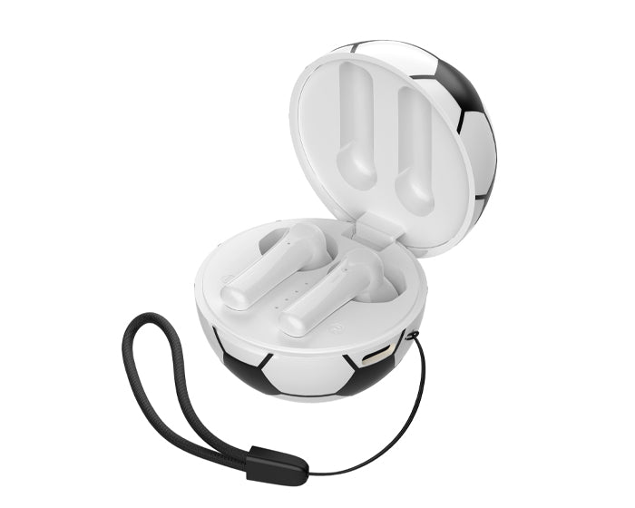 audífonos inalámbricos bluetooth con estuche de carga de 220 mah en forma de balón de fútbol soccer. cuentan con función de manos libres, alcance de hasta 10 m, entrada tipo c (incluye cable) y correa para transporte. duración aprox. de reproducción de 4 hrs. tiempo de carga 2 hrs. compatibles con dispositivos android e ios. presentación: caja a color.