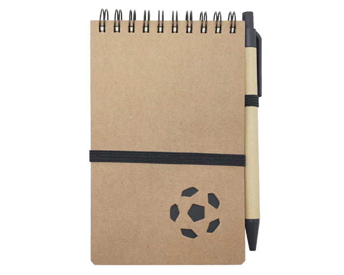 libreta ecológica de cartón con diseño de balón de fútbol, 70 hojas rayadas (140 páginas), espiral metálico color negro y cinta elástica. incluye bolígrafo de papel con clip de plástico.