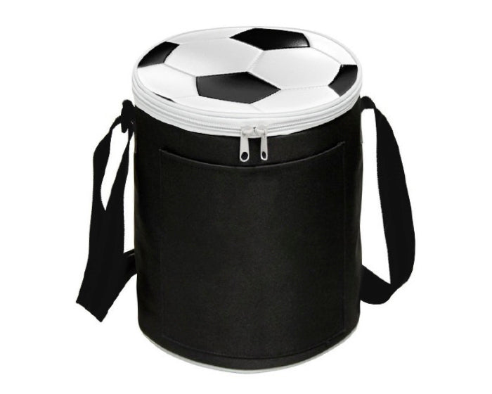 hielera circular con diseño de fútbol, cubierta cosida e interior termosellado en plástico anti escurrimiento. cuenta con un compartimento frontal y correa ajustable.