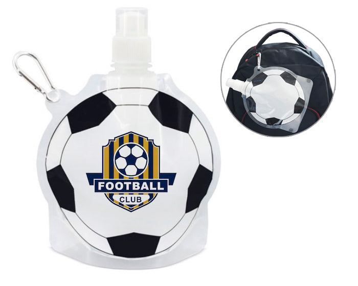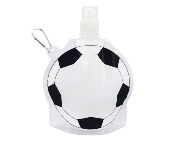 bolsa para bebidas con diseño de balón de fútbol, con tapa de rosca y válvula con tapón, incluye arnés metálico para colgar. cap. 800 ml.