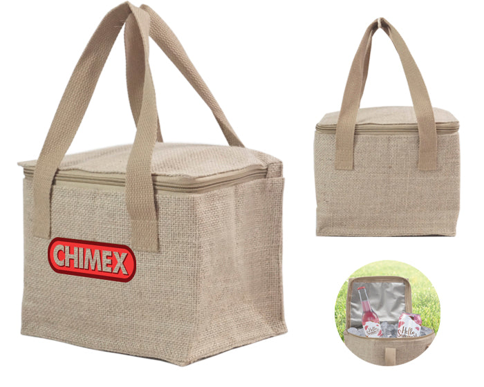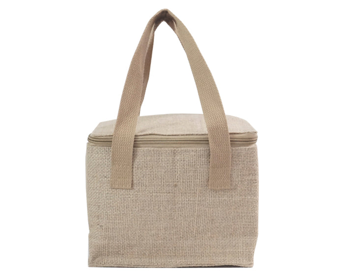 lonchera / hielera de yute con cubierta e interior térmico cosido en plástico anti escurrimiento, con cierre y asas de algodón.