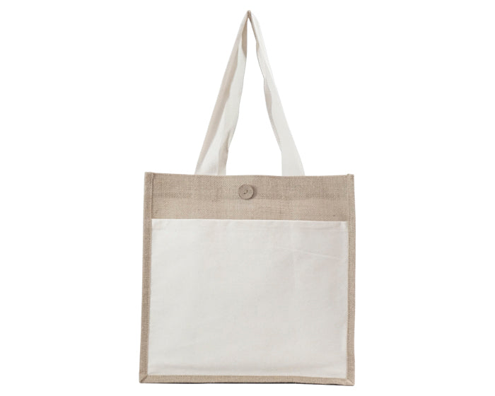 bolsa cosida de yute con interior laminado. cuenta con un compartimento de algodón al frente, botón de madera con cordón para su cierre y asas de algodón.