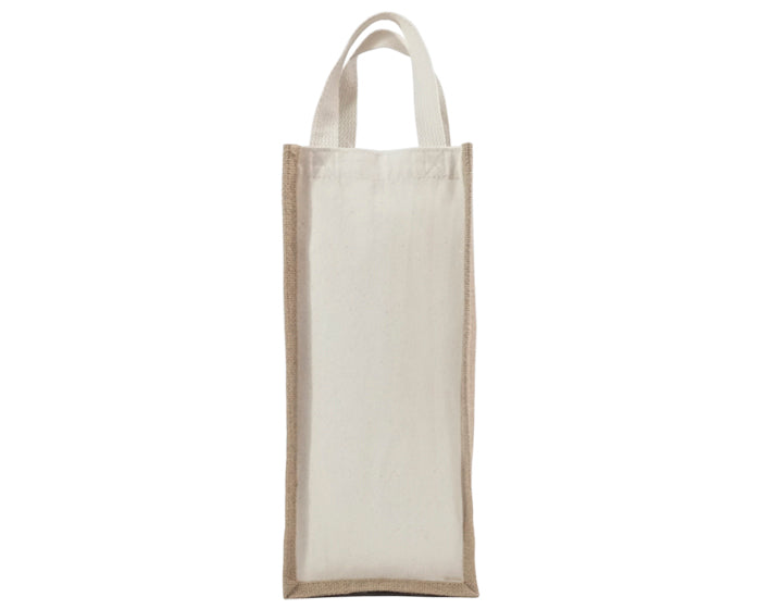 bolsa de algodón cosida, ideal para botellas de vino, con laterales de yute e interior plastificado y asas de algodón.