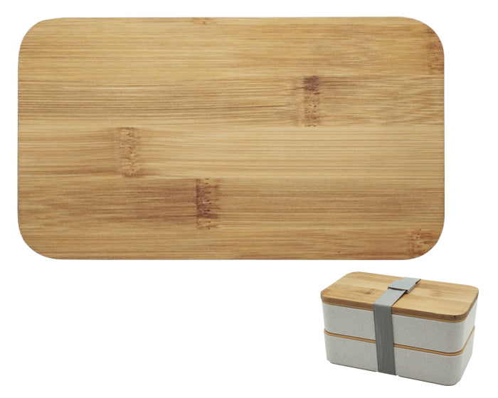 box lunch doble de fibra de trigo con tapa de bambú que incluye: base divisora con 3 cubiertos (cuchara, tenedor y cuchillo), separador de alimentos y resorte de seguridad para fácil cierre.