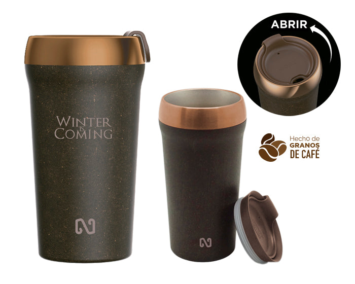 termo nayad neo de 14 oz. de doble pared, la interna es de acero inoxidable y externa de granos de café reciclado. mantiene bebidas calientes por 3 hrs. y bebidas frías 5 hrs. en la parte superior tiene un cintillo metálico color bronce. cuenta con tapa a presión con seguro giratorio, previendo salpicaduras. cap. 414 ml. (14 oz). presentación: caja de color. *libre de bpa.