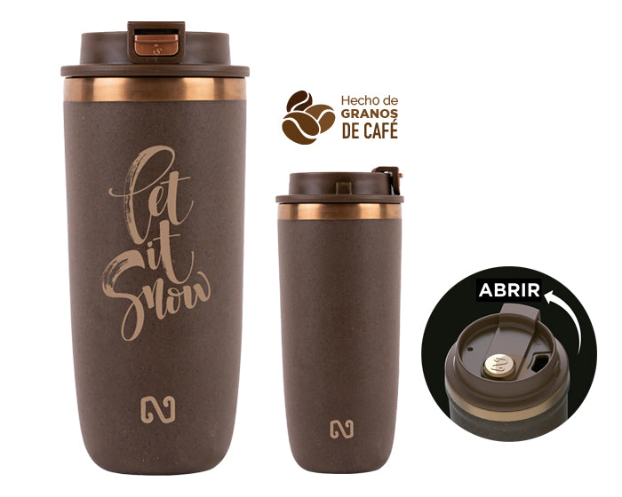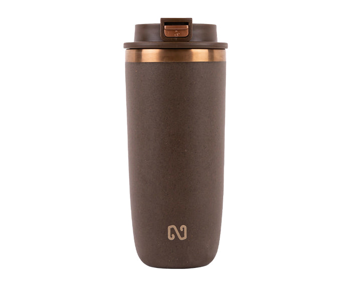 termo nayad neo de 16 oz. de doble pared, la interna es de acero inoxidable y externa de granos de café reciclado. mantiene bebidas calientes por 3 hrs. y bebidas frías 5 hrs. en la parte superior tiene un cintillo metálico color bronce que combina con el botón y seguro dorado de su tapa, misma que es de rosca, hermética, anti derrames y anti escurrimiento, para abrir hay que quitar el candado de seguridad y girar la tapa superior hacia la izquierda. cap. 480 ml. (16 oz). presentación: caja de color. * libre de bpa.