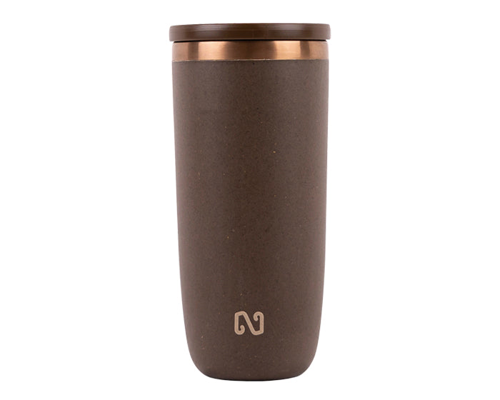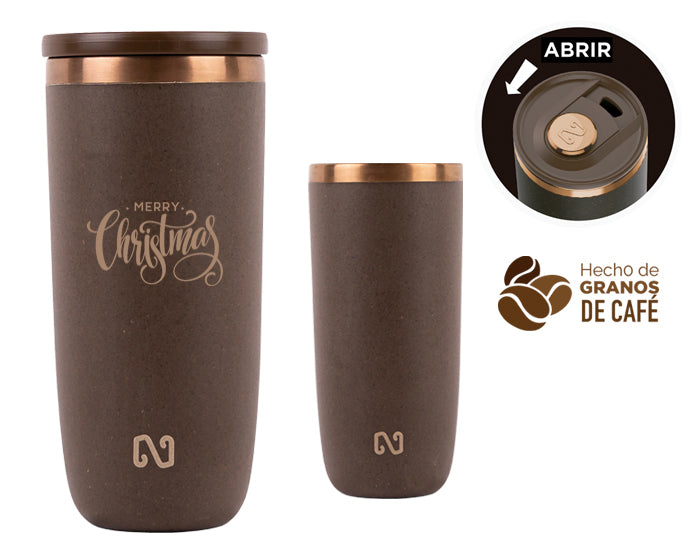 termo nayad neo de 16 oz. de doble pared, la interna es de acero inoxidable y externa de granos de café reciclado. mantiene bebidas calientes por 3 hrs. y bebidas frías 5 hrs. en la parte superior tiene un cintillo metálico color bronce que combina con el botón dorado de su tapa, que hay que deslizar hacia atrás para su fácil apertura. cuenta con tapa hermética de rosca anti derrames y anti escurrimiento. cap. 480 ml. (16 oz). presentación: caja de color. * libre de bpa.