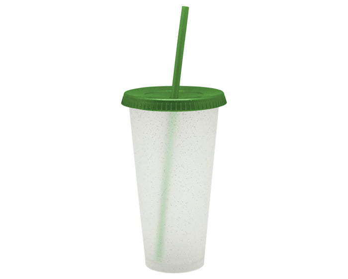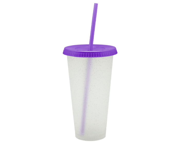vaso de plástico pp traslúcido con glitter de colores, cuenta con tapa a presión de color y popote del mismo color de la tapa. cap. 700 ml. *bpa free.