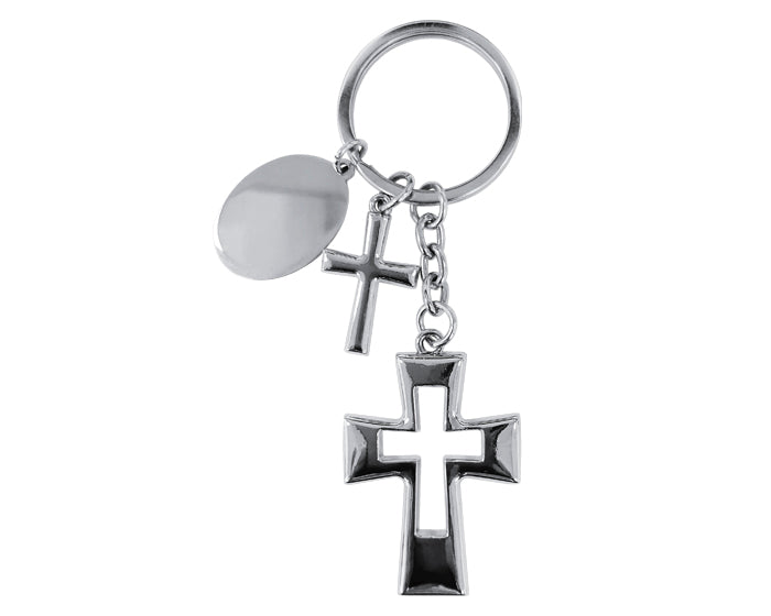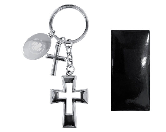 llavero con 2 cruces y placa de aleación de zinc y arillo reforzado. presentación: caja individual de cartón en color negro.