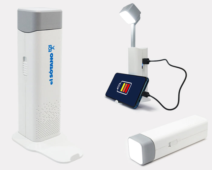 lámpara de lectura plegable de manejo portátil que incluye: luz led con botón de 3 intensidades (con duración aprox. de 4 hrs.) base desprendible que se utiliza como soporte para celular, power bank con capacidad de 1200 mah con puerto usb y entrada de carga. incluye cable de carga universal. presentación: caja en color blanco.