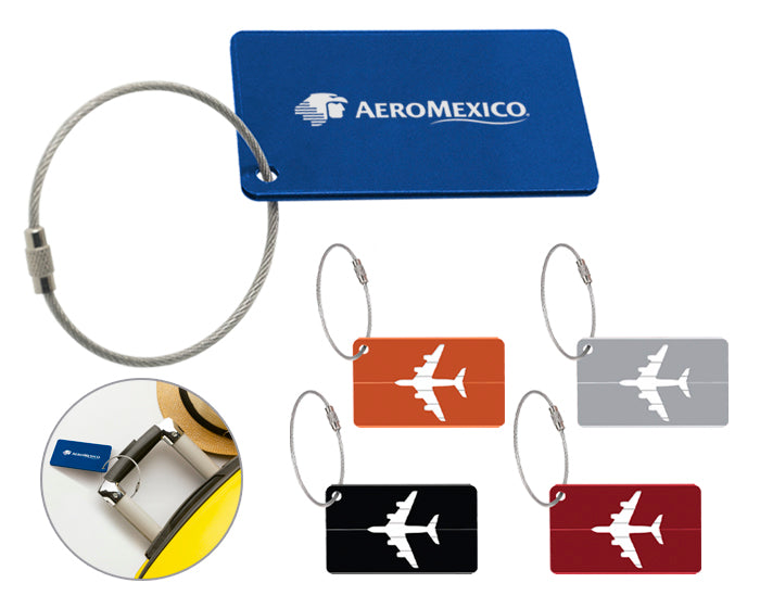 identificador de equipaje de aluminio con detalle de avión. cuenta con una pulsera con seguro giratorio hecho de alambre galvanizado recubierto de pvc y una tarjeta para datos personales (español/inglés) con mica protectora.