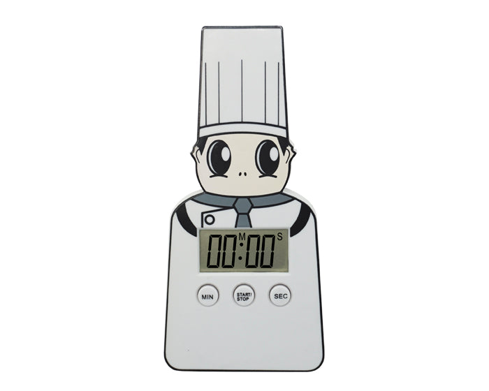 temporizador de cocina con diseño de chef de 99 min./59 seg. cuenta con pantalla digital, interruptor de encendido y apagado, botón de minutos, segundos y de inicio con sonido. incluye imán en la parte trasera y batería de botón para su funcionamiento. presentación: caja en color blanco. presentación: caja en color blanco.
