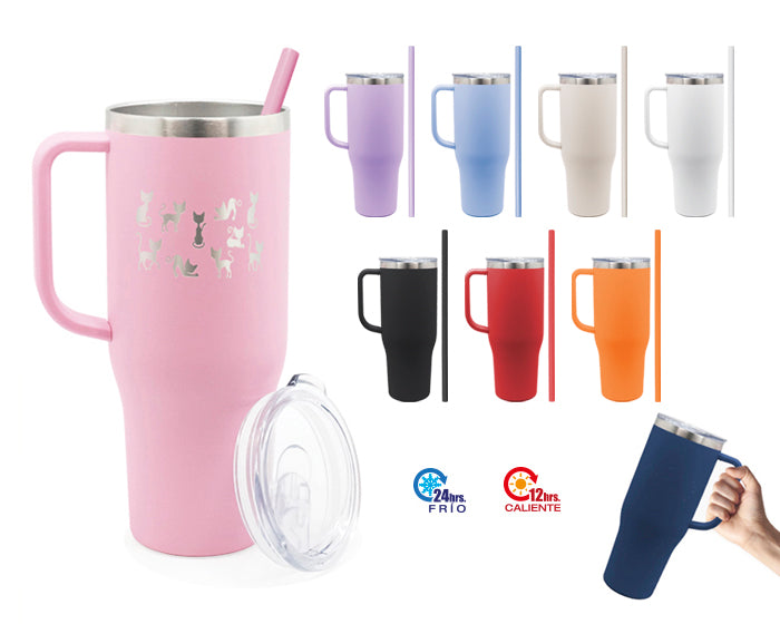 termo de doble pared de acero inoxidable insulado al alto vacío con capa interior de cobre, cuenta con acabado de polvo plástico y asa de plástico. mantiene bebidas calientes por 12 hrs. y bebidas frías por 24 hrs. incluye tapa transparente de cierre a presión con seguro deslizable y popote del color del termo. cap. 1,200 ml. presentación: caja en color blanco.