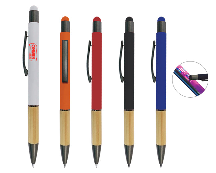 bolígrafo de aluminio con touch screen, grip de bambú, clip de metal, cuerpo con terminado tipo rubber. mecanismo de click.