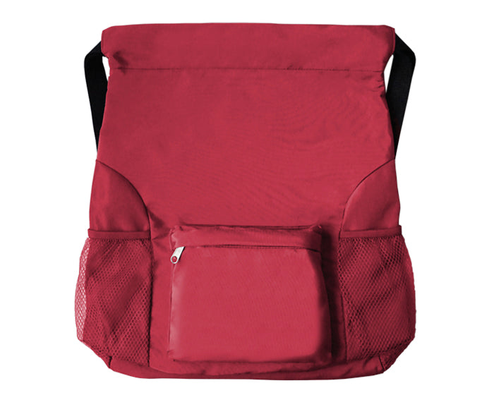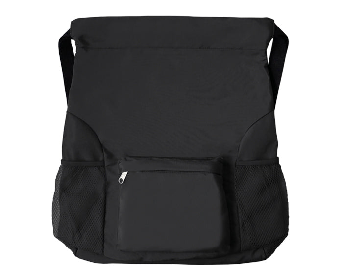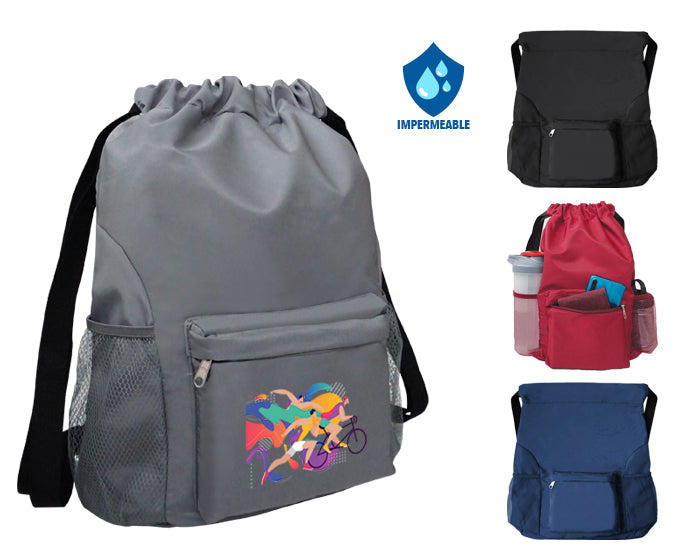 morral tipo backpack semi-impermeable con tirantes ajustables que sirven para cerrar el producto, bolsas laterales de malla e interior con doble forro y división para guardar accesorios. cuenta con un compartimento frontal con cierre.