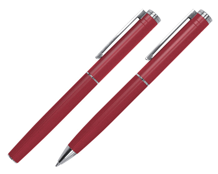 set de bolígrafos metálicos, lisos en su parte superior y con una sutil textura de líneas verticales en su parte inferior; esmaltado mate con detalles en color plata en el centro, extremos y clip. un bolígrafo es tipo roller y el otro es con sistema retráctil. cuenta con repuesto metálico. presentación: caja de regalo color negro.