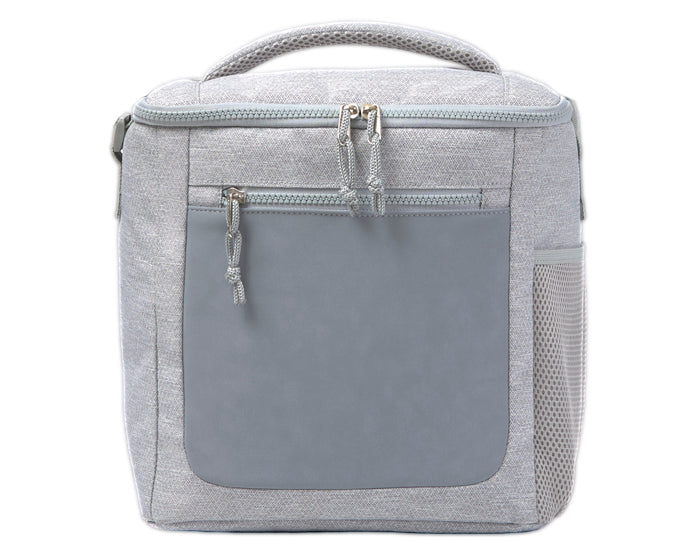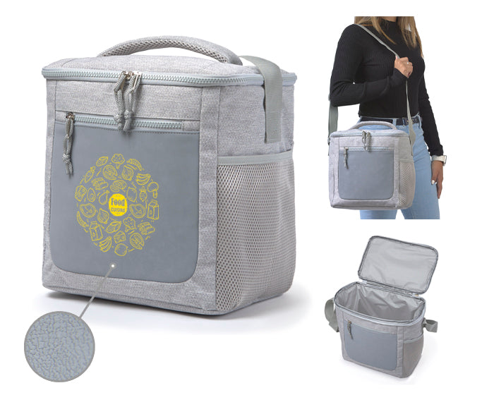 lonchera/hielera con tejido texturizado, cuenta con doble cierre en la cubierta, interior termosellado en plástico anti escurrimiento, compartimento frontal con textura y cierre, compartimento lateral de malla con resorte, asa acolchada y correa ajustable para transportar.
