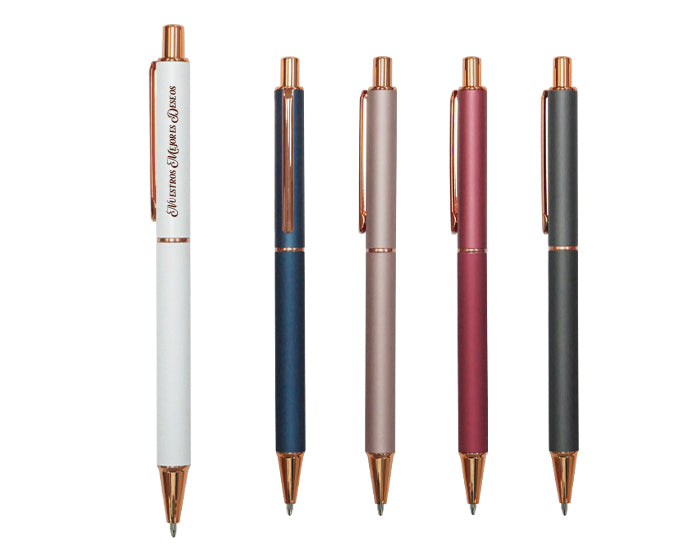 bolígrafo delgado de aluminio, con botón, clip, detalle central y punta, cromados en color oro rosa. barril superior con acabado metálico mate y barril inferior en el mismo color, con acabado de goma. mecanismo de click.