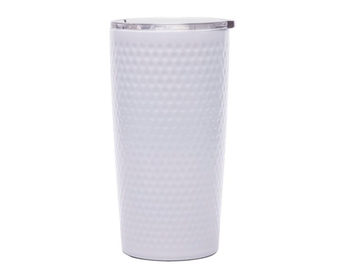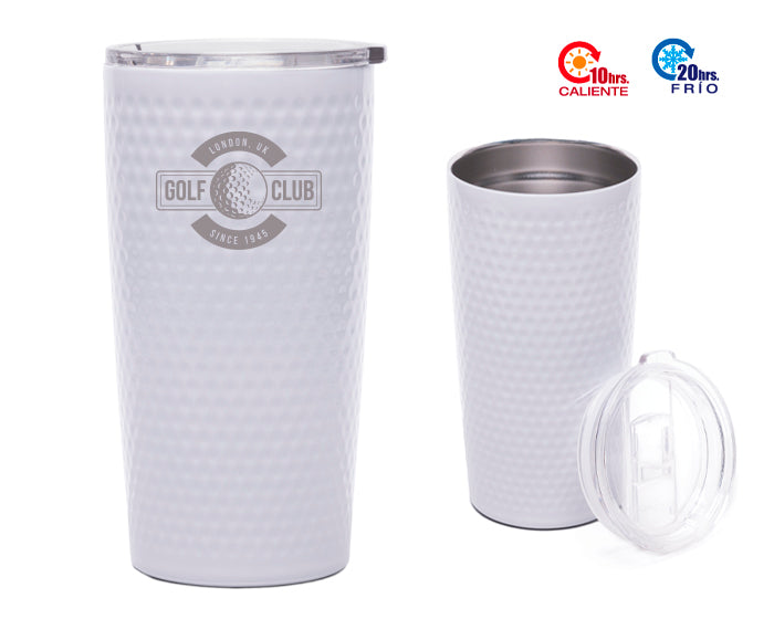 termo de doble pared de acero inoxidable insulado al alto vacío, tiene una sutil textura de pelota de golf; conserva las bebidas calientes por 10 hrs. y frías por 20 hrs. cuenta con tapa a presión transparente con seguro deslizable. cap. 590 ml. presentación: caja en color blanco.