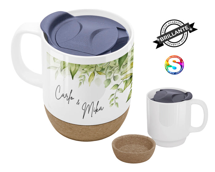 taza de cerámica para sublimación acabado brillante. cuenta con base de corcho removible y tapa a presión con seguro deslizable. cap. 385 ml. (13 oz). presentación: caja en color kraft.