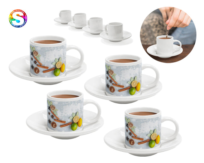 juego de café o té para sublimar, incluye 4 tazas con su plato. cap. 90 ml. (3 oz). presentación: caja en color kraft.