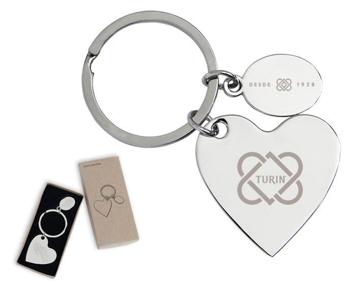 llavero en forma de corazón con placa de aleación de zinc y arillo reforzado de hierro. presentación: caja individual de kraft.