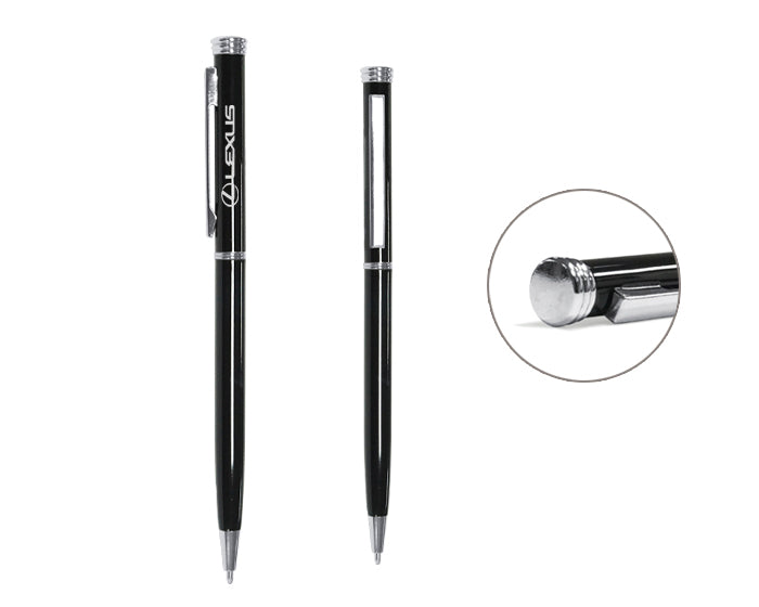 bolígrafo metálico de suave escritura y cuerpo delgado en color negro satinado, cuenta con clip, punta, anillos centrales y detalle superior cromados. mecanismo retráctil.