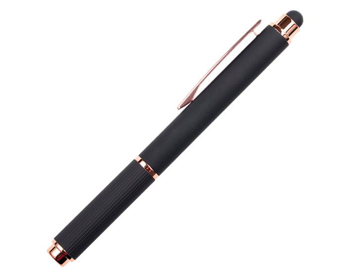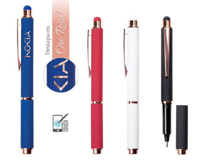bolígrafo de aluminio tipo roller, con acabado de goma suave al tacto y detalles en oro rosa. cuenta con touch screen en la parte superior del color del bolígrafo y su tapa cuenta con sutiles líneas verticales. al grabar en laser co2, destapa en color oro rosa.