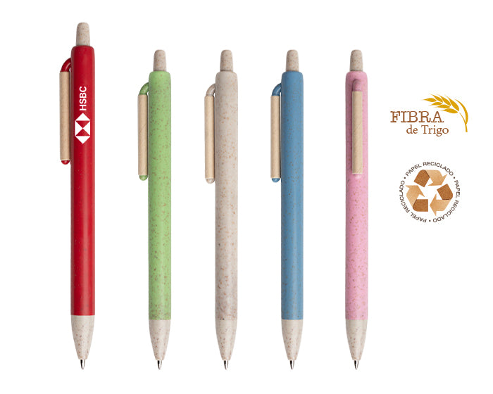 bolígrafo ecológico de fibra de trigo con mecanismo de click; punta y botón en color natural y clip con cubierta de cartón.