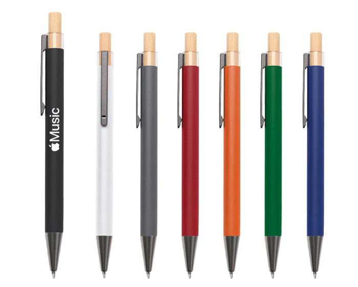 bolígrafo de aluminio con mecanismo de click, acabado tipo rubber, tiene botón de bambú y detalle de plástico transparente donde se sujeta el clip metálico; clip y punta en color grafito.