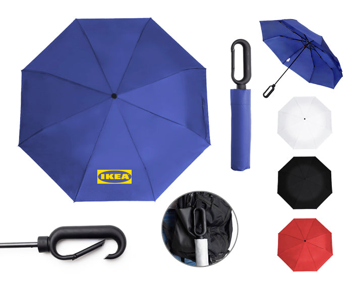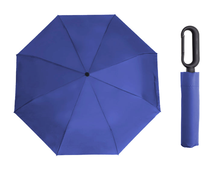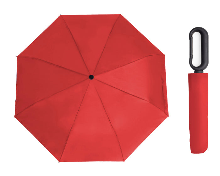 paraguas de bolsillo de 8 gajos, con botón de sistema de apertura manual, eje de metal y varillas de fibra de vidrio, mango de plástico con gancho para colgar. incluye funda individual.