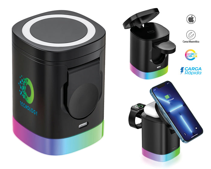 apple watchcargador magnético inalámbrico de carga rápida qi (15w) 3 en 1 para dispositivos electrónicos. incluye: compartimento de carga para celular (15w), reloj inteligente (3w carga solo dispositivos apple watch) y audífonos (5w), cuenta con base para apple watchy dispositivo móvil plegable, luz led multicolor, botón de encendido/apagado que funciona como modelador de la luz led. puerto de carga tipo c. incluye cargador. compatible con dispositivos ios. presentación: caja de regalo a color. (verifique la compatibilidad con sus dispositivos móviles).
