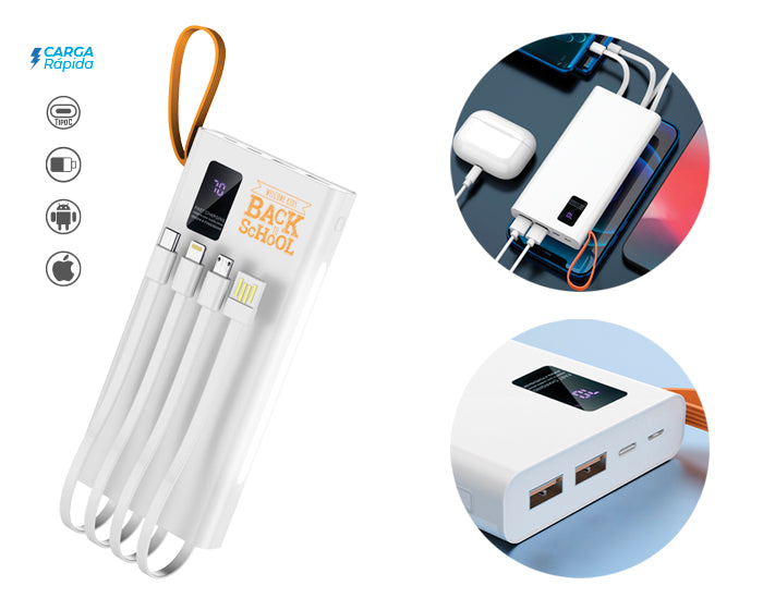 batería portátil 4 en 1 de carga rápida (22.5w) con capacidad de 10,000 mah, con asa de silicón para transportar. cuenta con botón de encendido/apagado, pantalla led que indica el porcentaje de carga, linterna led, 2 puertos de carga usb, 1 puerto de carga tipo c, 1 puerto de carga micro usb. incluye 4 cables de salida para cargar dispositivos móviles: 1 cable para iphone, 1 cable usb, 1 cable micro usb, 1 cable tipo c. compatible con dispositivos android e ios. presentación: caja de regalo a color.