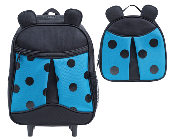 mochila infantil con diseño de catarina y carrito para transportar que cuenta con: compartimento interno con cierre, compartimento externo con cierre, bolsa de malla lateral con resorte y asa para transportar, además incluye una lonchera con compartimento interno cosido de plástico anti escurrimiento con cierre y con el mismo diseño de catarina, cintillo en la parte trasera para adaptarse al carrito y asa para transportar. además la lonchera puedes guardarla dentro de la mochila.