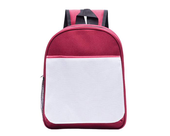 mini mochila con solapa desmontable para sublimación, con cierre y broche de pegol, asa y correas ajustables, cuenta con un compartimento frontal y 2 bolsas laterales de malla con resorte.