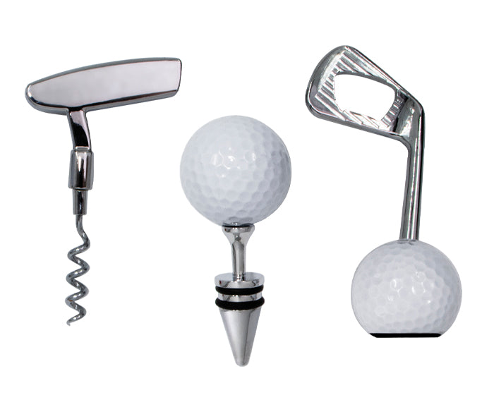 set de herramientas para vino en forma de accesorios de golf, contiene: 1 destapador, 1 tapón para botellas y 1 sacacorchos. presentación: caja en color negro.