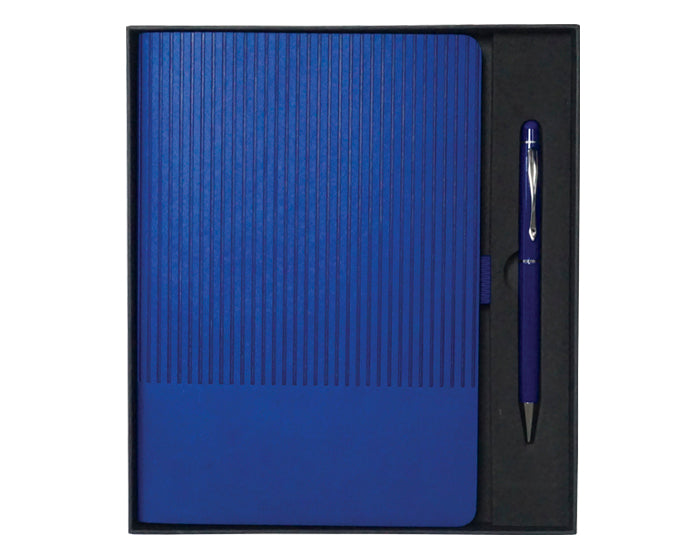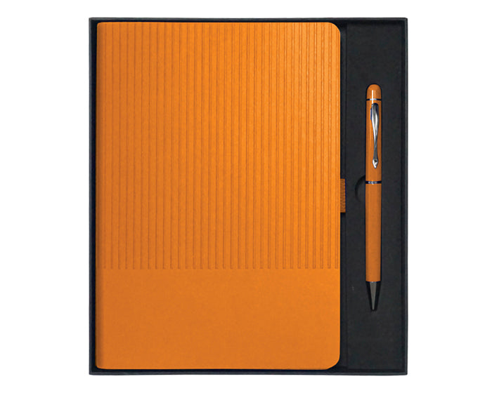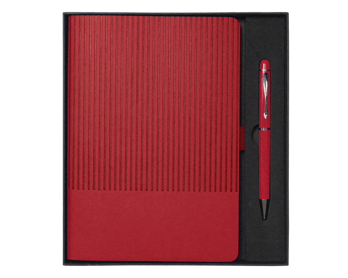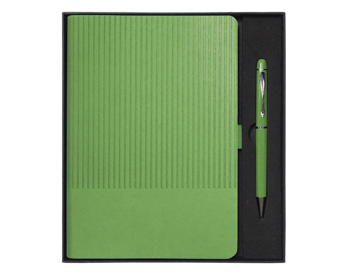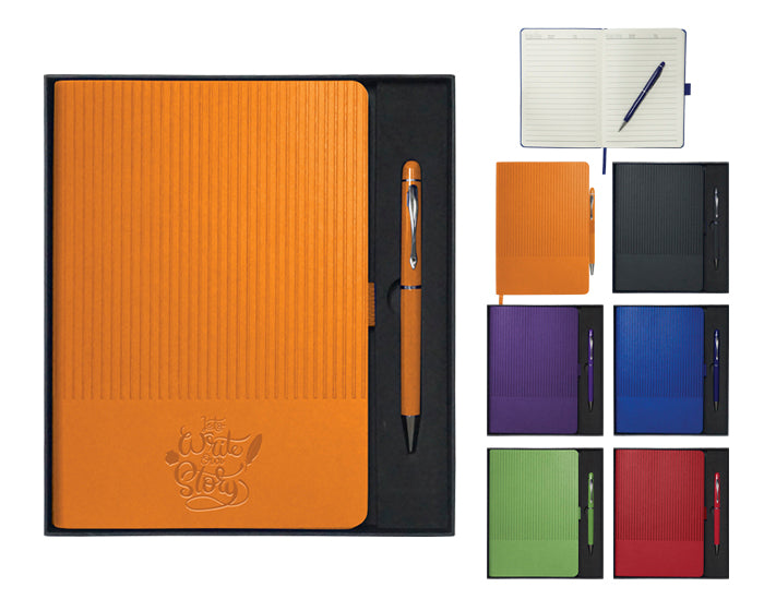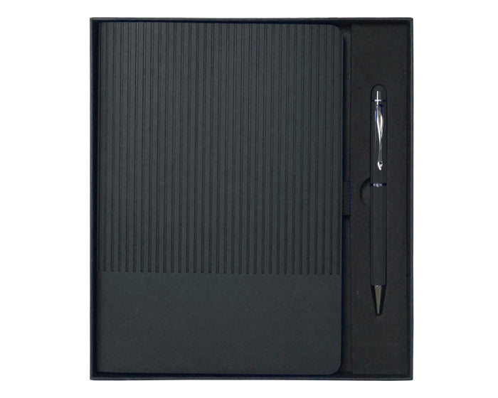 set de libreta con bolígrafo metálico. la libreta cuenta con pasta flexible, con textura de líneas verticales en la parte superior y área lisa en la parte inferior para poder personalizarse fácilmente. es de 96 hojas rayadas (192 páginas), papel de 80 gr. color crema. tiene listón separador en color de la pasta. incluye bolígrafo de aluminio del color de la libreta con touch screen y detalles en cromo. presentación: caja de regalo en color negro.