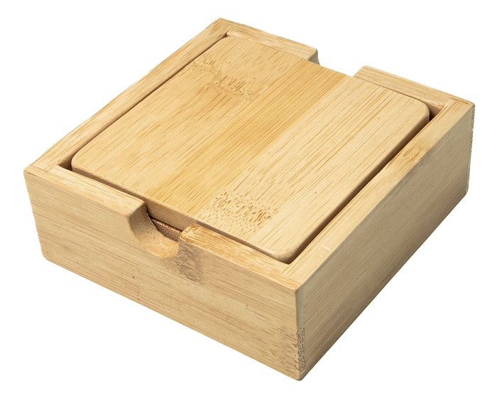juego de portavasos de bambú que incluye: 4 portavasos y una base para guardar. presentación: caja en color blanco.