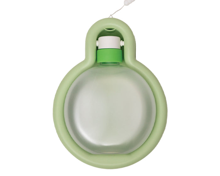 recipiente de plástico para mascotas en forma de globo con boquilla de rosca y base plegable que funciona como bebedero. incluye asa de silicón para transportar. cap. 500 ml.