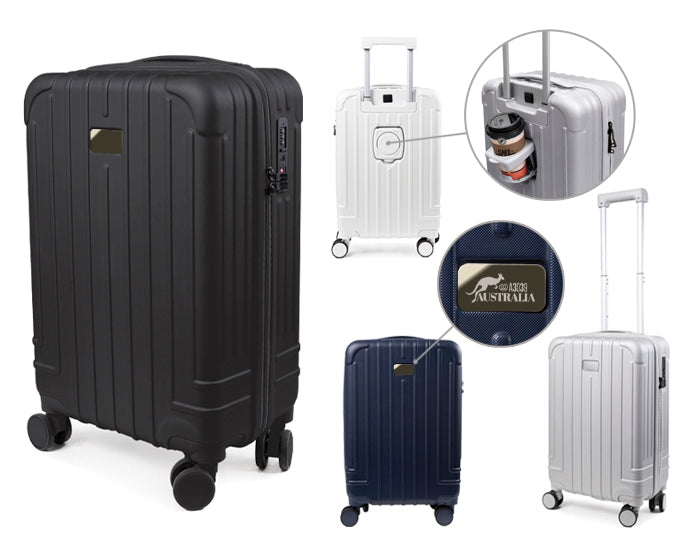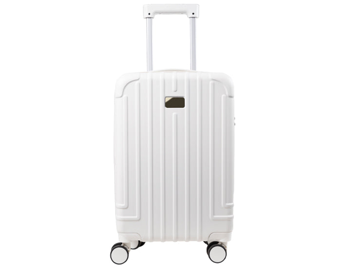 maleta de viaje texturizada con ruedas dobles que hacen juego con el color de la maleta. cuenta con candado de seguridad tsa con contraseña, asa metálica expandible de 2 niveles con mango de plástico, asa superior y doble cierre. interior de doble compartimento 1 para guardar prendas húmedas y otro para accesorios con cierre y elástico de seguridad para sujetar, en el exterior de la maleta incluye puerto de carga usb para conectar tus dispositivos móviles, un porta vasos plegable en la parte trasera de la maleta. incluye placa metálica por separado para grabar. tamaño ideal para transportar en aerolíneas económicas.