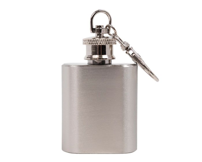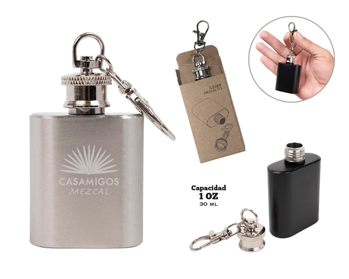 licorera de bolsillo con broche para colgar con tapa de rosca. cap. 1 oz. (30 ml.). presentación: caja individual de kraft.