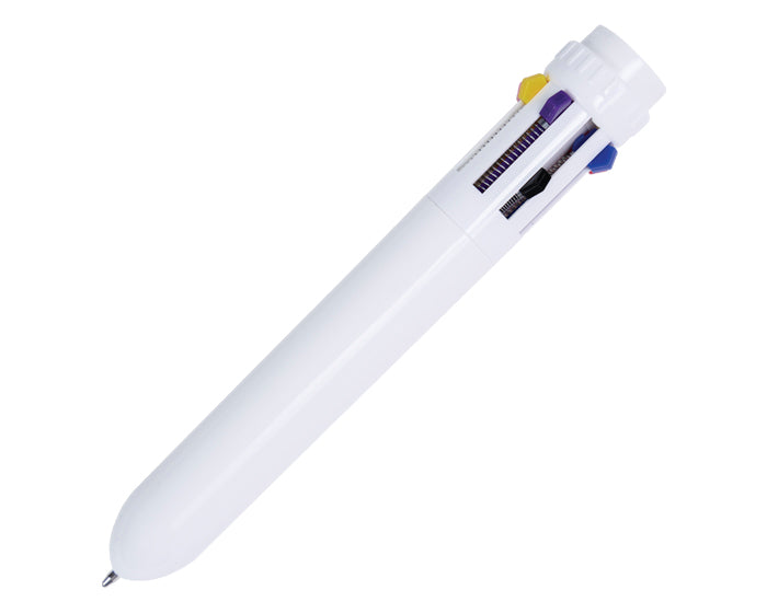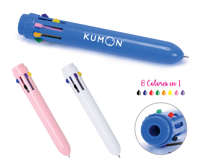 bolígrafo de plástico multitintas, incluye 8 colores de tinta diferentes.