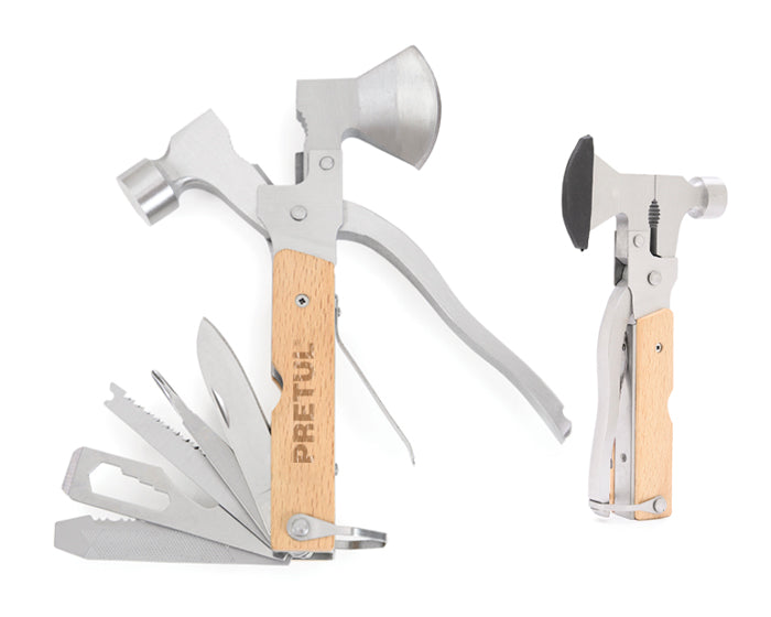multi herramienta plegable tipo martillo con mango de madera y 14 funciones: hacha, alicatas redondas, alicatas planas, martillo, navaja de sierra con lima, desarmador plano pequeño, destapador de botellas, llave múltiple, desarmador plano grande, descamador de pescado, desarmador de cruz, navaja, cortador de alambre y arillo para colgar. presentación: caja de regalo a color.