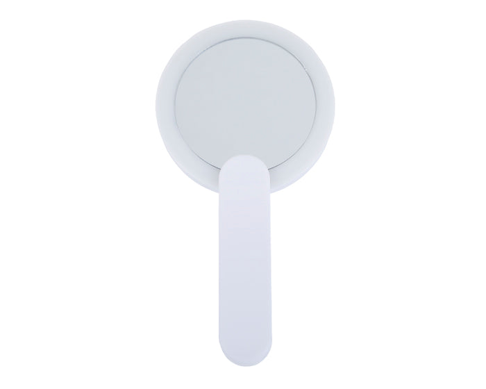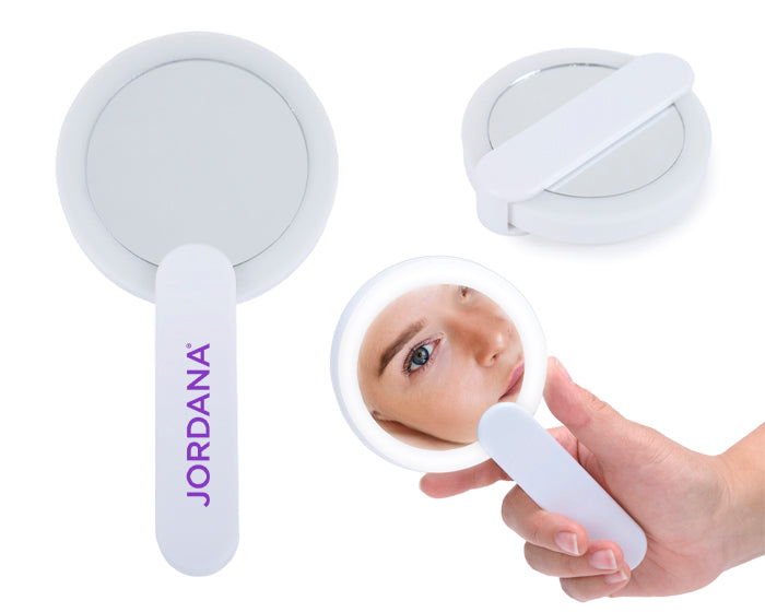 espejo de bolsillo con 12 luces led y mango giratorio que sirve como soporte. tiene botón de encendido y apagado. incluye 2 baterías de botón. presentación: caja en color blanco.