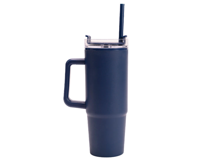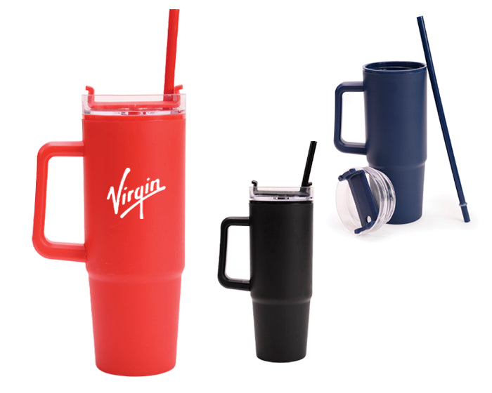 termo de plástico de doble pared con asa. cuenta con tapa transparente con cierre de rosca y sobre tapa giratoria en color del termo, con ranura para popote. incluye popote de color. cap. 770 ml.