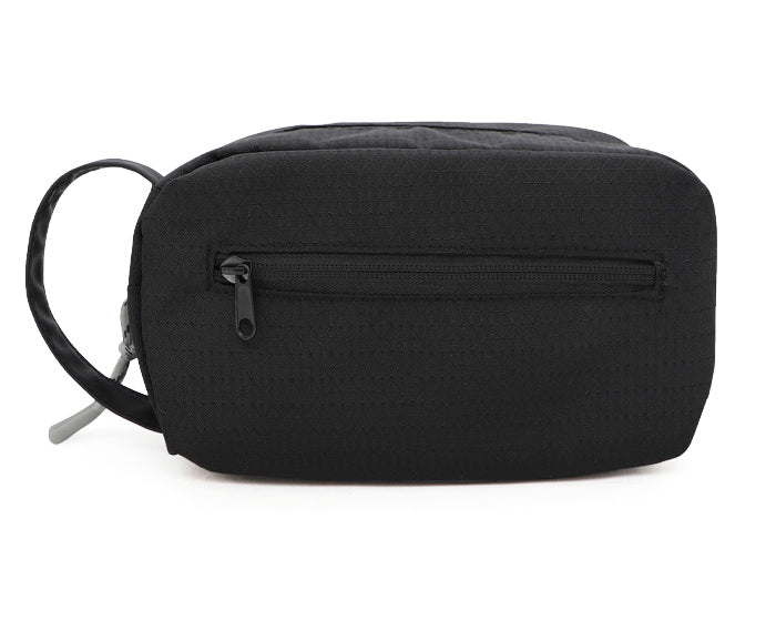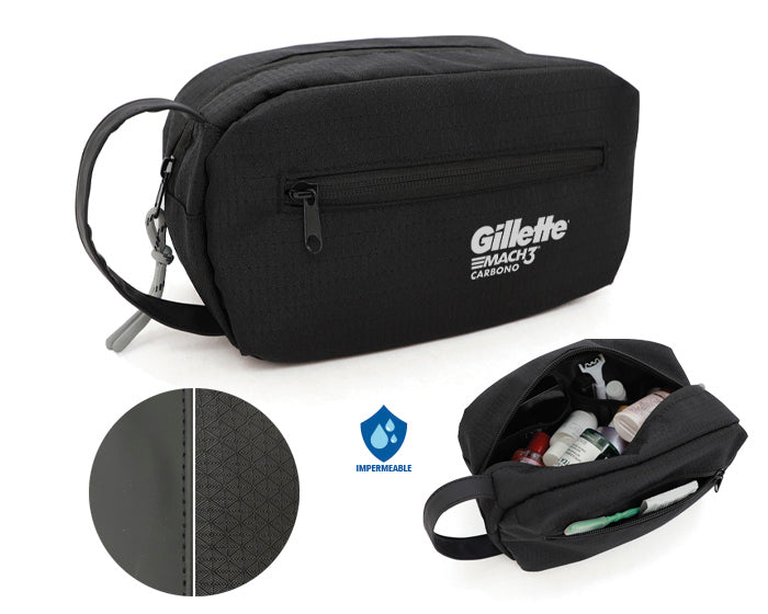 neceser de viaje de poliéster texturizado con bolsillo exterior frontal; compartimiento principal con forro, 2 bolsillos internos de red y cierre central con tirador. cuenta con asa exterior de curpiel para transportar.