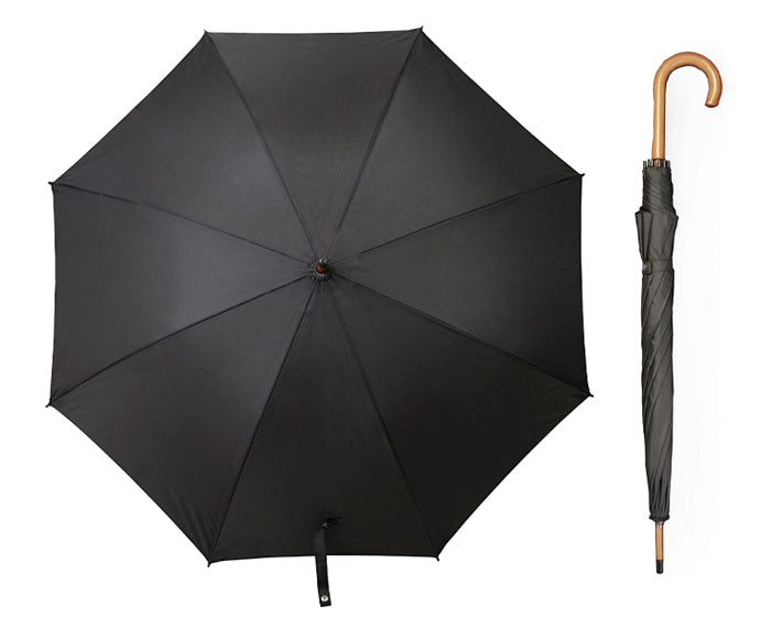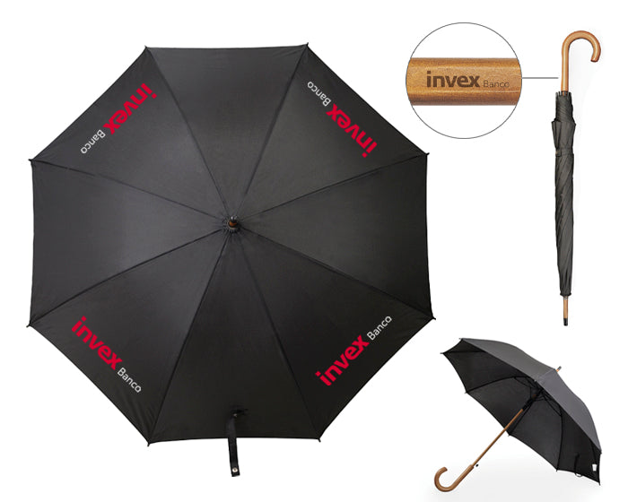 paraguas de 8 gajos con botón de apertura automática, varillas de fibra de vidrio, bastón y mango curvo de madera.