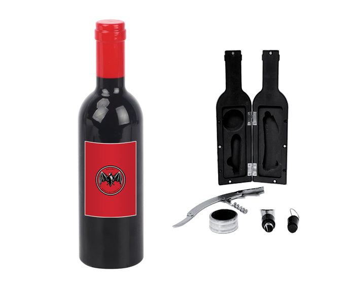 set de vino con acabado brillante y punta de color que incluye: sacacorchos manual, servidor con tapón y boquilla, anillo anti derrames. presentación: caja individual.