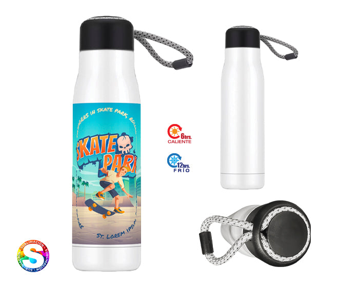 termo de doble pared para sublimación insulado al alto vacío. mantiene las bebidas frías por 12 hrs. y calientes por 8 hrs. tapa de rosca con asa de poliéster para sujetarlo fácilmente. cap. 500 ml. (17 oz). presentación: caja en color negro.